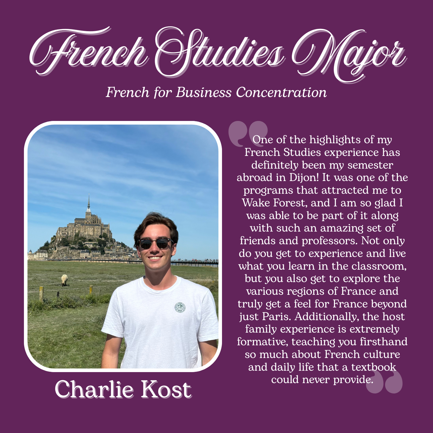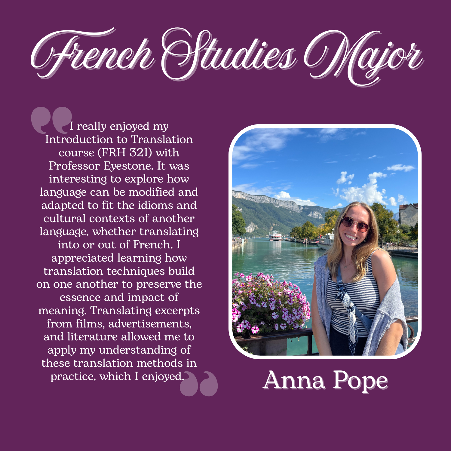Several French Studies majors and minors serve as student ambassadors each year. Ambassadors help organize departmental events, reach out to students, and promote our programs.